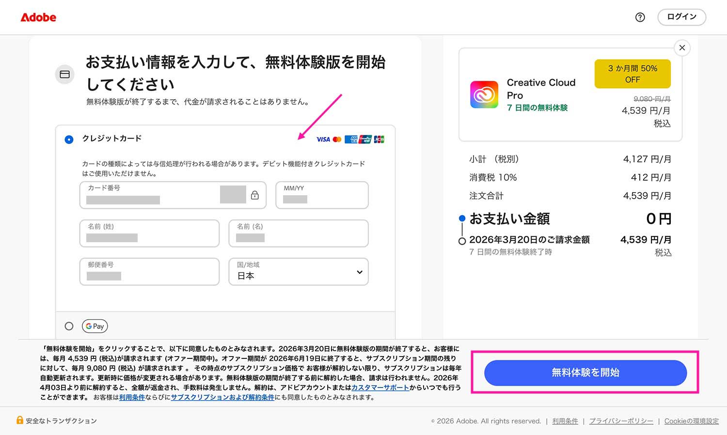 クレジットカード情報を入力して「無料体験を開始」をクリック。